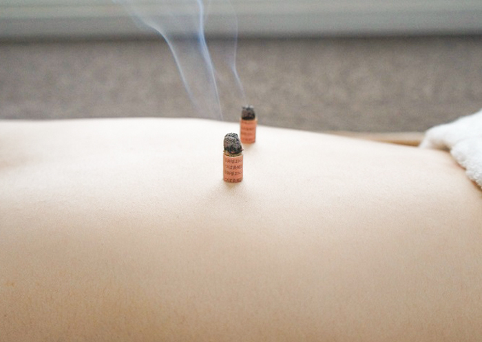 鍼の上にお灸をさして行う治療で、お灸の熱がステンレス制の鍼に伝わり、ホットパックなどの物理療法よりも身体の深部まで温まります。